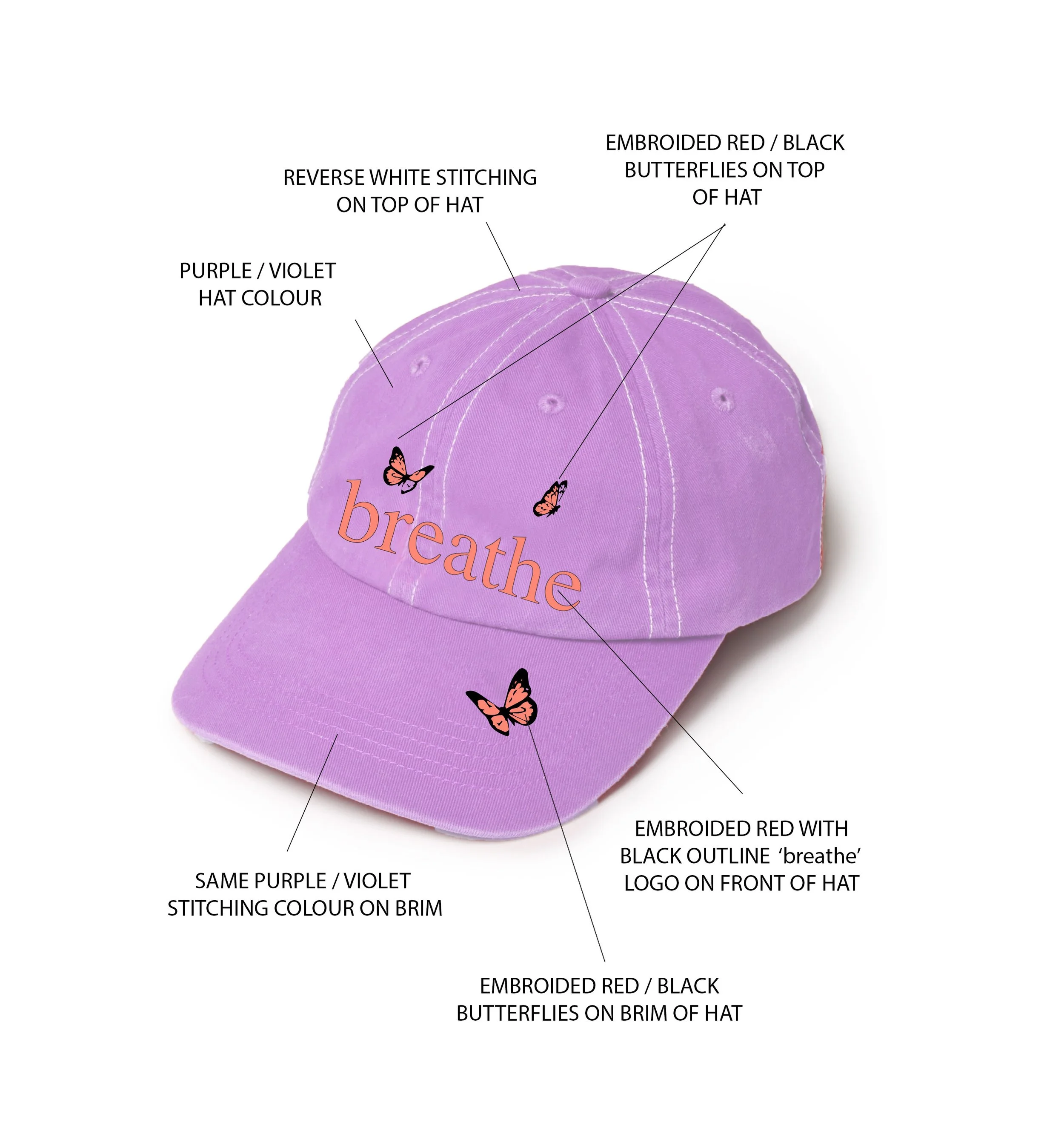 My Breathe’s first design came as a violet cap with red and black butterfly digitally printed. Reverse white stitching with the breathe logo as well as a butterfly stitched into both the cap brim and cap itself.
